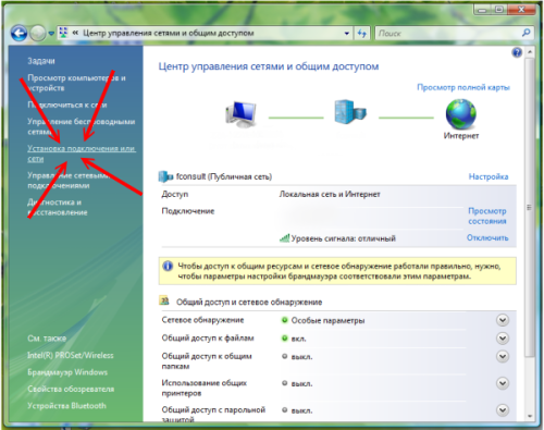 - Щелкните по этому пункту меню и в открывшемся окне найдите "Установка подключения или сети":
