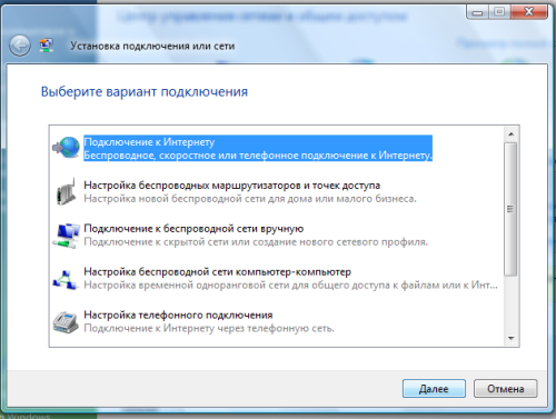- В появившемся окне выберете пункт Подключение к Интернету,