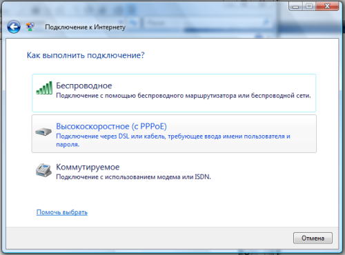 - В появившемся окне выберете пункт Выскоскоростное (с PPPoE).