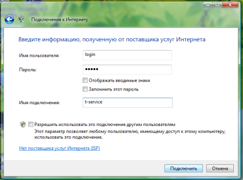 - Введите "Логин" и "Пароль" указанные в Вашем договоре, а также укажите имя подключения, например, как показано на рисунке: